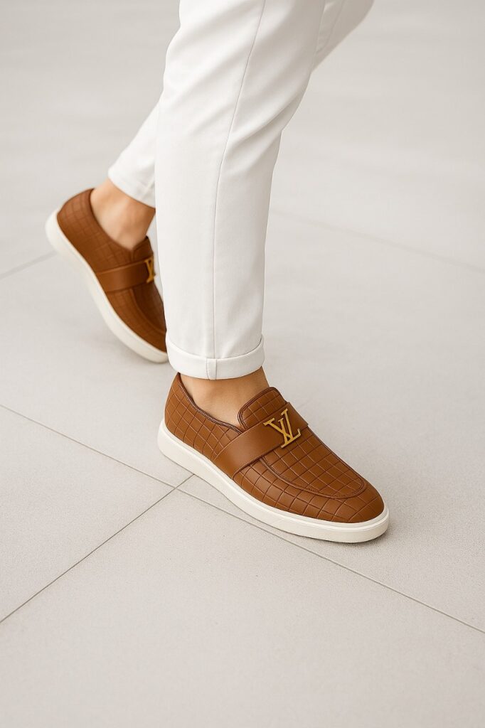 Step into contemporary sophistication with the Shoe Flux Brown Textured Loafers. Designed for men who appreciate both luxury and comfort, these loafers feature a unique grid-textured leather upper combined with a clean white outsole for a modern edge.